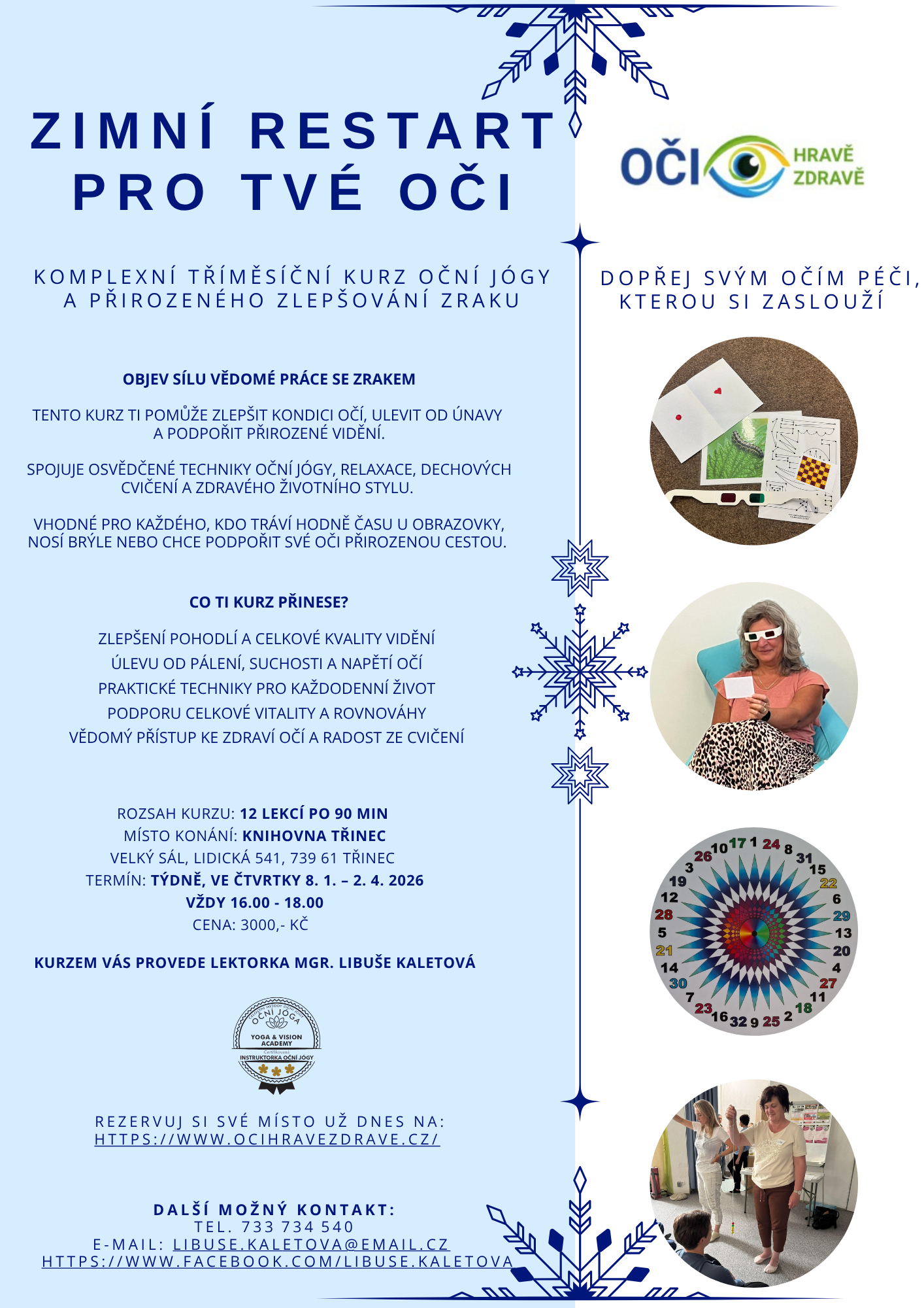 Tento kurz Ti pomůže zlepšit kondici očí, ulevit od únavy a podpořit přirozené vidění. Spojuje osvědčené techniky oční jógy, relaxace, dechových cvičení a zdravého životního stylu. Vhodné pro každého, kdo tráví hodně času u obrazovky, nosí brýle nebo chce podpořit své oči přirozenou cestou.